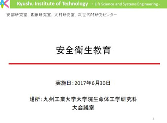 <前期> 日 時: 平成29年6月30日 18:00~19:30 場 所: 生命体工学研究科 講義室2 内 容: (1)安全について (2)安全ビデオ「低圧電気取扱の基礎知識」の視聴